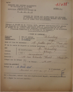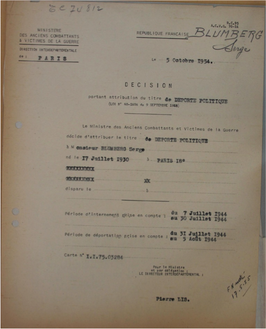 Le 5 octobre 1954, Serge avait été reconnu « déporté politique », ce qui signifie qu’il a été arrêté dans le cadre de la politique antijuive menée conjointement par l’occupant nazi et le gouvernement français de Vichy. Une carte de déporté de couleur bleue est remise à Armand au nom de son fils ce même jour.